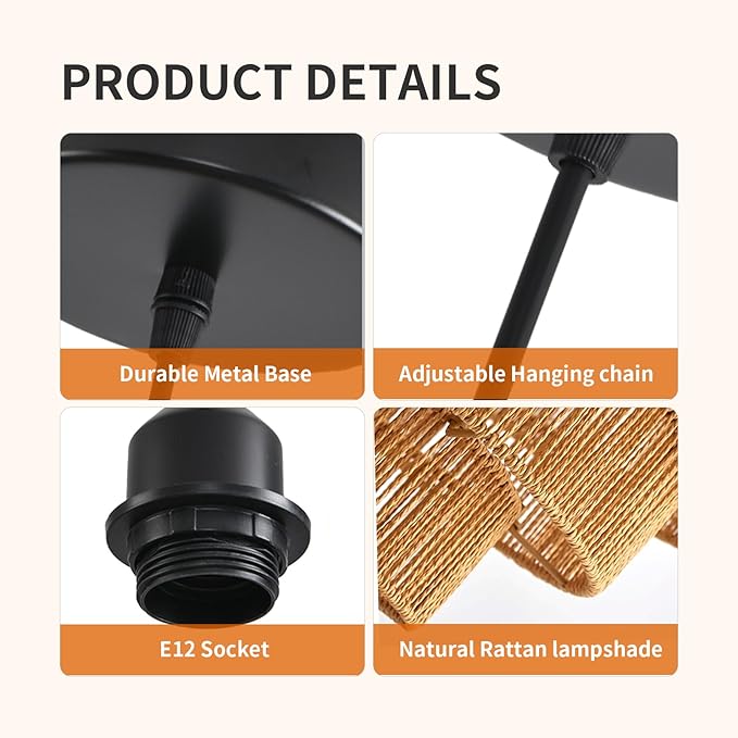 - 🍀5-Minute Easy Installation (No Pro Tools Needed):All mounting hardware, electrical wires, and clear step-by-step instructions are included. Simply screw the lamp holder to the ceiling, adjust the cord length, and install the bulb—even beginners can finish setup of this rattan hanging light in under 5 minutes. This hassle-free process makes rattan pendant lights a go-to choice for quick home upgrades.