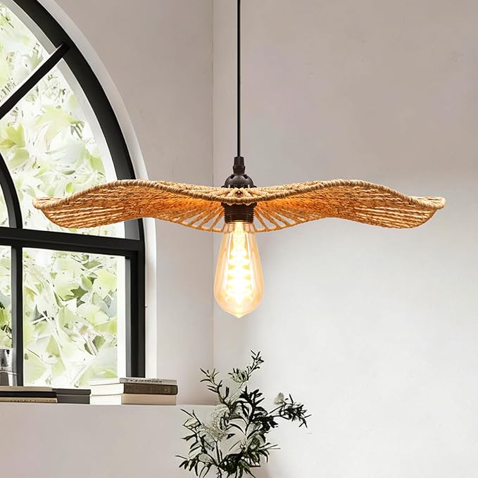 - 🌻Adjustable Design for Every Ceiling Type: 59" fully adjustable electric cord makes this rattan pendant lights adaptable to your space’s needs. It works flawlessly with flat, sloped, or vaulted ceilings—customize the hanging height to turn a rattan hanging lamp into the perfect centerpiece over a kitchen island, or let a rattan hanging light complement a dining table with ease.