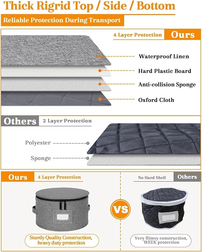- 【Multi-Layer Protection & Stackable】Rigid top, sides, and bottom allow safe stacking. Felt dividers and padded compartments protect dinnerware and glassware from bumps, scratches, and impacts during moving or storage.