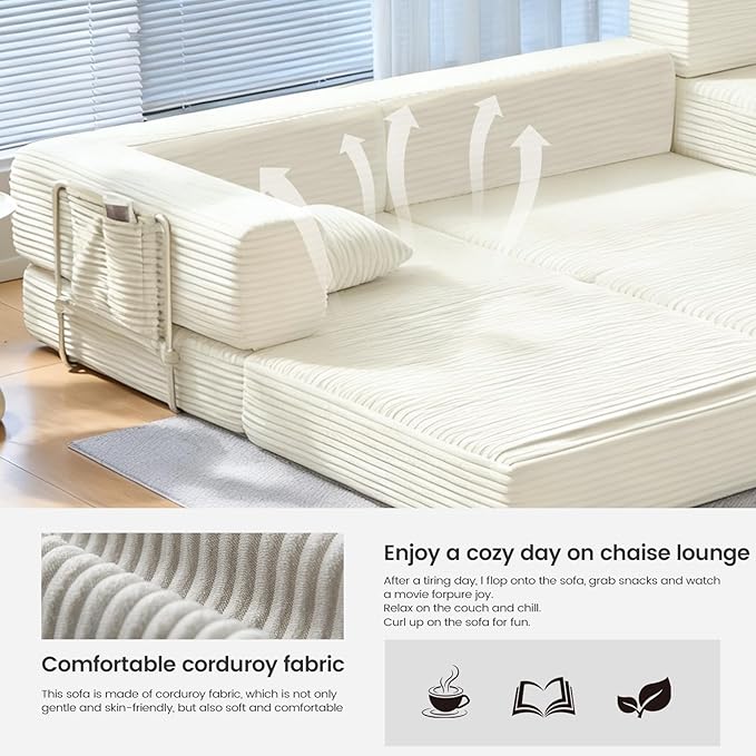 Folding Sofa Bed Convertable Corduroy Couch King Size Floor Sleeper 4-in-1 DIY Combination Modular Sofa Fold Out Futon Lounge Comfy Foldable Lazy cama for Living Room (Off-White)
