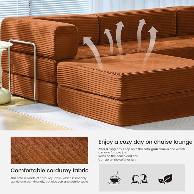 Folding Sofa Bed Convertable Corduroy Couch King Size Floor Sleeper 4-in-1 DIY Combination Modular Sofa Fold Out Futon Lounge Comfy Foldable Lazy cama for Living Room (Orange)