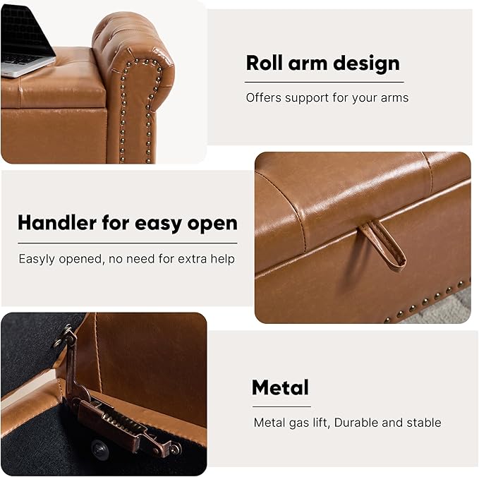 Storage Bench for Bedroom, 51" Upholstered End of Bed Bench, Faux Leather Queen Size Benches with Rolled Arms, Tufted Button Storage Long Ottoman, Living Room, Entryway, Brown