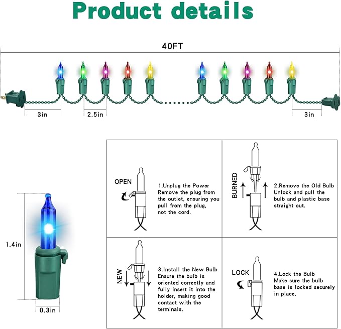 - 【Unique Design Christmas Lights】The Multicolor string lights bulbs are snap-on design, which is very easy to replace. When one of our bulbs is broken, it will not affect other bulbs. This is a very good design. You can replace the broken bulbs individually with the spare bulbs or fuses we provide.