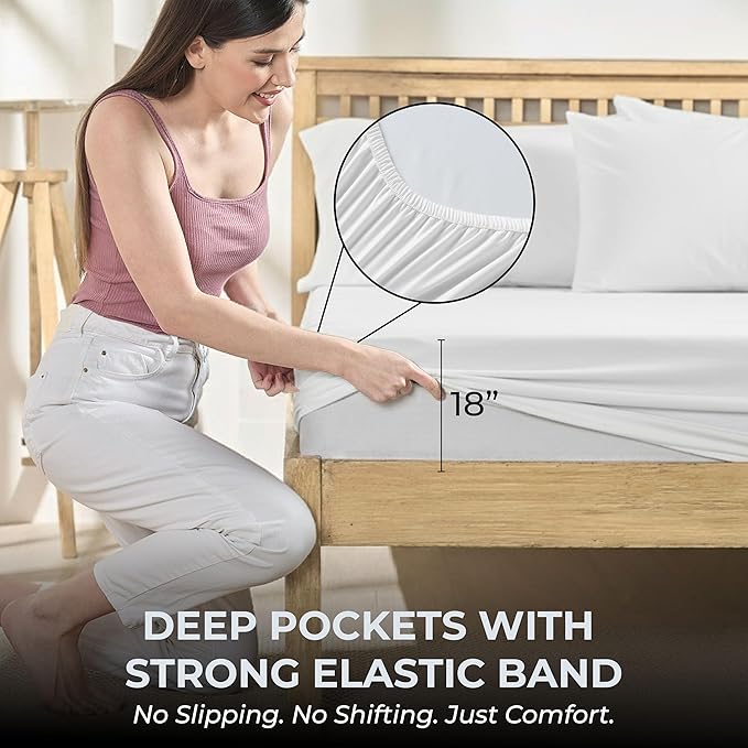 - Secure Deep Pocket Design: Fitted sheets include reinforced elastic bands and extra-deep 18-inch pockets that adapt to a variety of mattresses, including thicker pillow tops. This dependable design keeps cotton bed sheets snug, prevents slipping and bunching, and ensures a consistently smooth surface for uninterrupted rest.