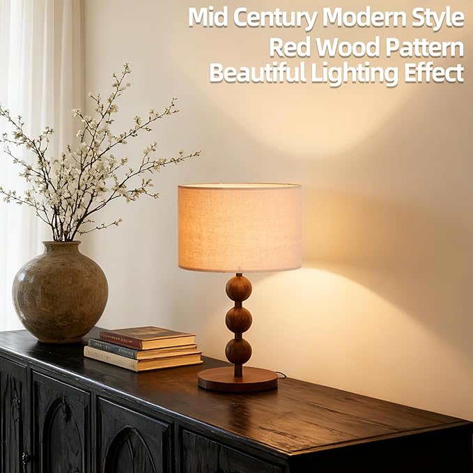 Bedside Nightstand Table Lamp for Bedroom Red Wood Pattern Iron Lamp with Fabric Shade, Mid Century Modern Farmhouse Table Lamp Desk Lamp for Living Room Home Office with LED E26 Bulb