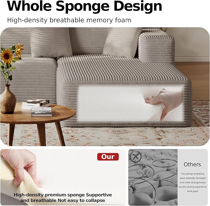 - Plush Corduroy & Detachable Sofa Set: Indulge in the premium feel of our plush corduroy fabric, which offers exceptional softness, warmth, and breathability. This detachable sofa set features a stain-resistant cover that is remarkably easy to remove and machine wash, ensuring your modular sectional sofa stays fresh, hygienic, and looking new for years with minimal effort.