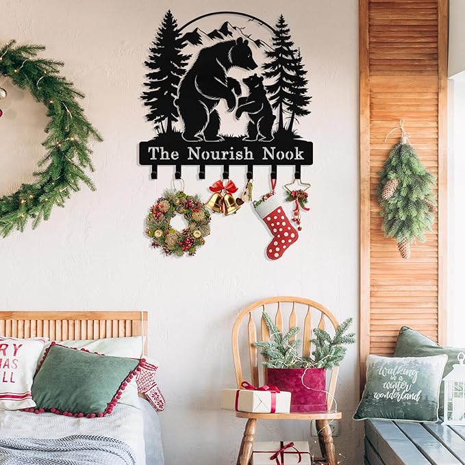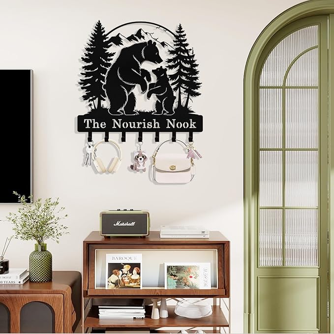 Personalized Bear Forest Key Holder Wall Mount, Custom Metal Key Holder for Wall with Name, Custom Keys Rack Hanger with Hooks for Entryway, Front Door, Hallway, Living Room, Kitchen