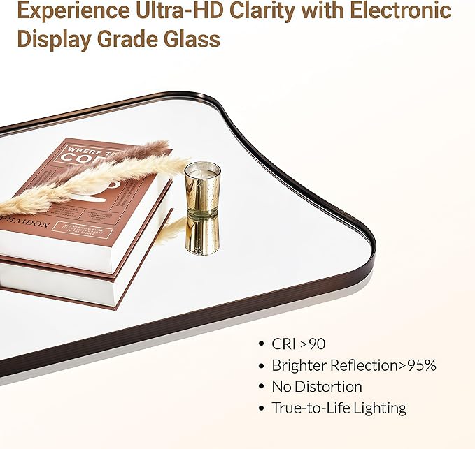 - 【Crisp True Reflections】: Our bathroom vanity mirror boasts crystal-clear reflections, thanks to premium silver glass that delivers true-to-life, distortion-free images. Built with robust construction for long-lasting use, it also features an easy-to-clean surface to keep your reflection crisp and pristine