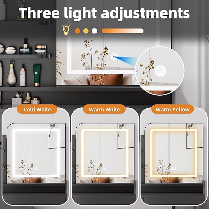 - Features a built-in LED light strip with 3 adjustable color modes (Warm White, Cool White, Soft Yellow) and stepless dimming. Create the perfect lighting for flawless makeup application, day or night, without the harsh glare of traditional bulbs.