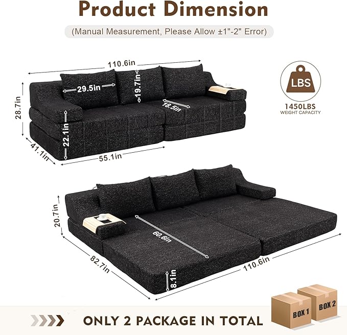 - 【No Assembly Required】: Your sofa bed queen arrives vacuum-packed. Simply unbox, gently pat it to restore its shape, and arrange the modules. Say goodbye to complicated setup to get instant comfort with this easy-to-use sofa bed