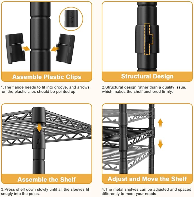 - Height-Adjustable Shelves: This garment rack features adjustable wire shelves and detachable hanging rods. The slip-sleeve locking system allows the shelves to be adjusted in 1-inch increments, maximizing storage space for shoes, bedding, hanging clothes, and folded seasonal garments