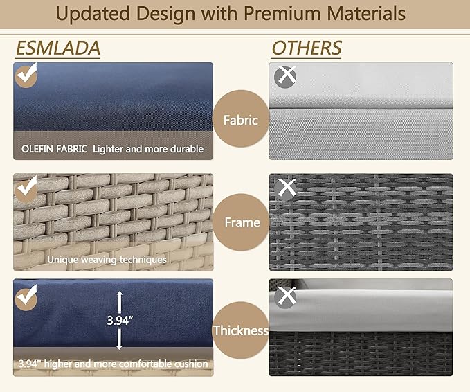 - 【FASHIONABLE NEW DESIGN】This latest outdoor patio conversation set is crafted with high-quality PE rattan weaving and thickened material that is water and UV resistant. The furniture is reinforced with a rust-resistant steel frame.