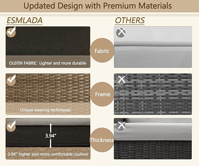 - 【FASHIONABLE NEW DESIGN】This latest outdoor patio conversation set is crafted with high-quality PE rattan weaving and thickened material that is water and UV resistant. The furniture is reinforced with a rust-resistant steel frame.
