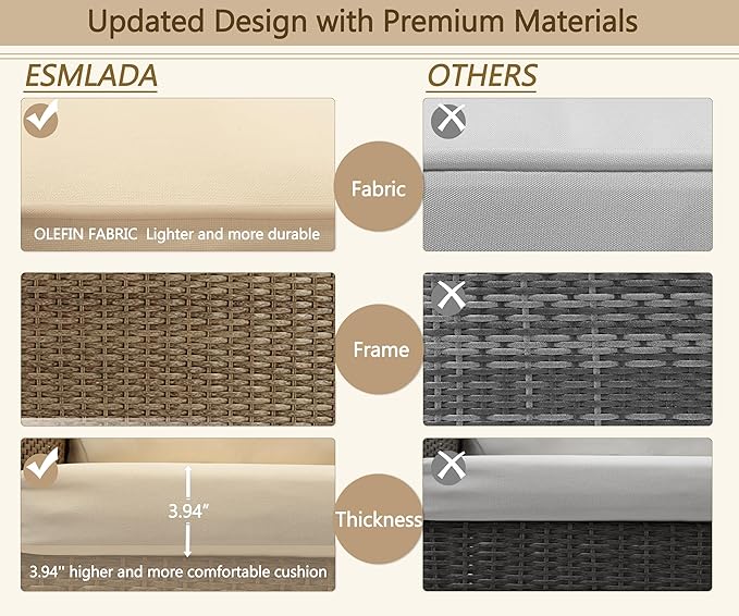 - 【FASHIONABLE NEW DESIGN】This latest outdoor patio conversation set is crafted with high-quality PE rattan weaving and thickened material that is water and UV resistant. The furniture is reinforced with a rust-resistant steel frame.