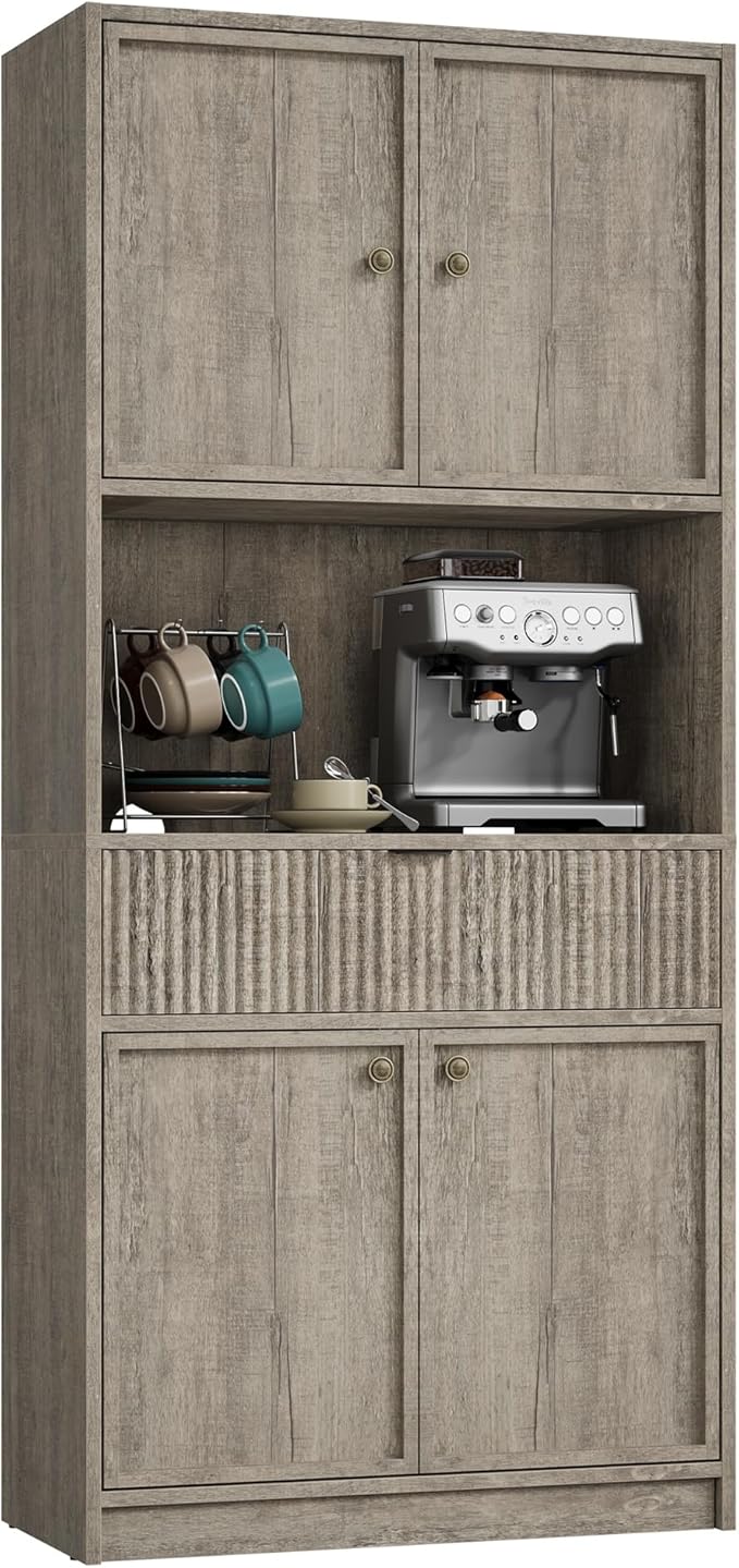 IDEALHOUSE Tall Storage Cabinet, 70" Kitchen Pantry Cabinet with Doors, Fluted Kitchen Hutch Cupboard with Microwave Shelf & Drawer, Freestanding Cupboard for Dining Room, Living Room, Gray