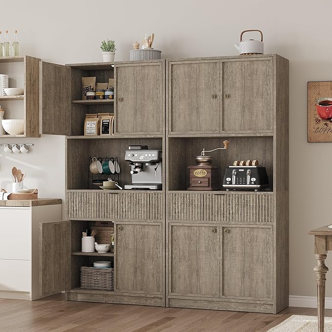 - Customizable & Versatile: Adapt this tall kitchen pantry cabinet to your needs - 2 adjustable shelves let you tailor space for items of all sizes (remove them entirely for a roomy display). Beyond the kitchen, repurpose it as a hallway console for photos/mementos, a living room organizer, or a chic coffee bar—versatility that grows with your lifestyle