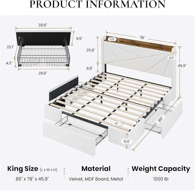 - Ample Storage Space: Three large, wheeled drawers with secure locks provide smooth access for bulky bedding and clothing, while the headboard's shelf keeps bedtime essentials like books and glasses within easy reach