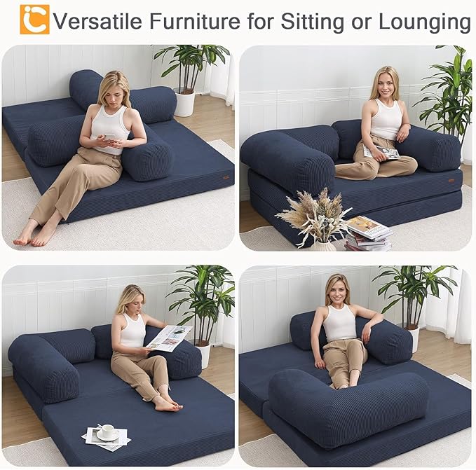 COMAX Folding Sofa Bed Queen, 4-in-1 Foldable Floor Couch Convertible Futon Sofa with Armrests, Sleeper Mattress Fold Out Chair Bed Comfy Portable Lounge Guest for Living Room Bedroom, Navy Blue