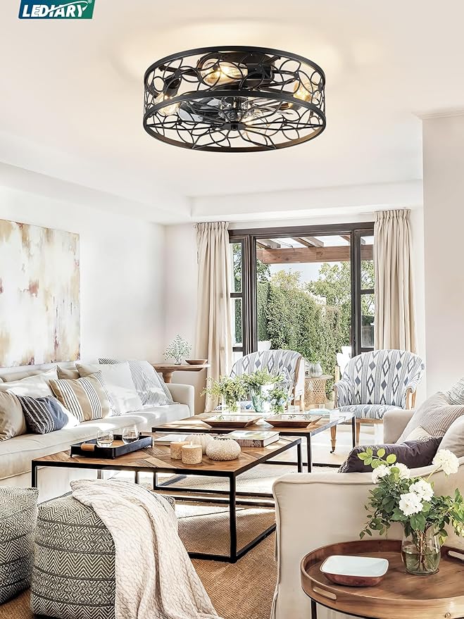 LEDIARY 20 Inch Caged Ceiling Fans with Lights, Black Flush Mount Ceiling Fan with Remote, Low Profile Bladeless Ceiling Fan Light Fixture for Bedroom, Kitchen, Dining Room
