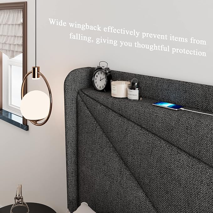 - Special Feature : Heavy-Duty Metal Frame, PD Type-C Fast Charging Station, Soft Linen Fabric, Squeak Resistant, Storage Wingback Headboard Heavy-Duty Metal Frame, PD Type-C Fast Charging Station, Soft Linen Fabric, Squeak Resistant, Storage Wingback Headboard