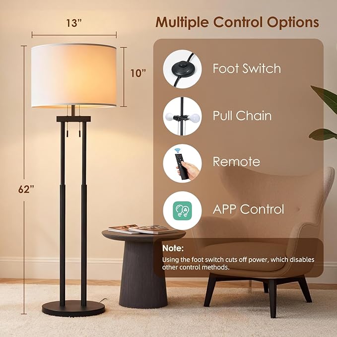 - Four Convenient Control Options: Control the lamp your way — pull-cord switch, foot pedal switch, remote control, or smartphone app. More flexible and easier to use than typical single-control floor lamps.