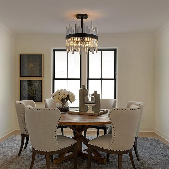 - Black Ceiling Light Fixtures Flush Mount - The 3-light black semi flush mount ceiling light fixture features a sturdy metal frame and elegant crystal glass strips, offering rust, dust and corrosion. The delicate crystal glass strips diffus the light farther and brighter, protecting your eyes from glare while providing an elegant and wonderful projection through the crystal glass strips to enhance the overall aesthetics of the room!