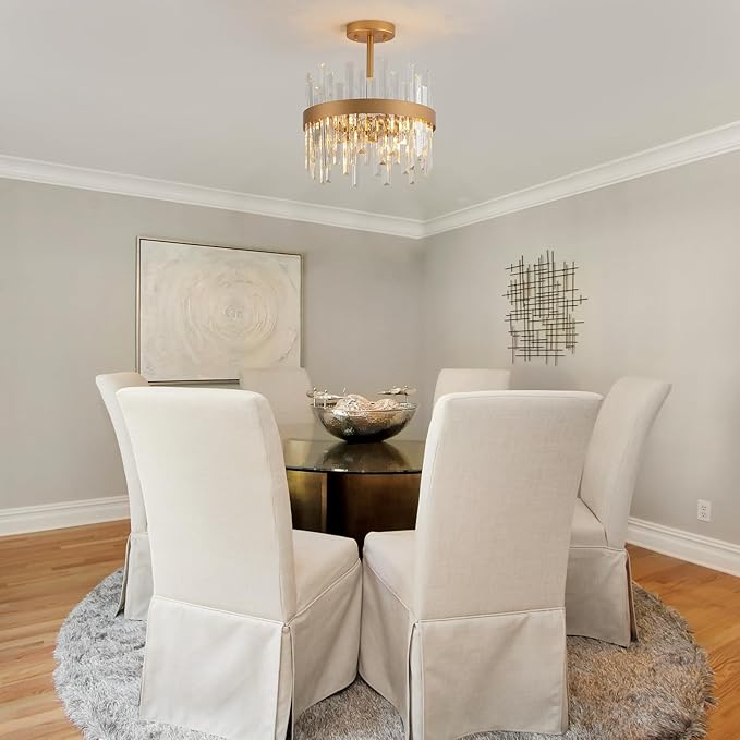 - Gold Ceiling Light Fixtures Flush Mount - The 3-light gold semi flush mount ceiling light fixture features a sturdy metal frame and elegant crystal glass strips, offering rust, dust and corrosion. The delicate crystal glass strips diffus the light farther and brighter, protecting your eyes from glare while providing an elegant and wonderful projection through the crystal glass strips to enhance the overall aesthetics of the room!