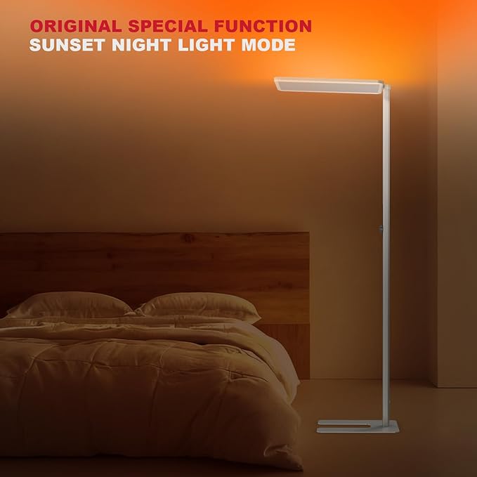 - 【Original design Sunset Nightlight, Motion & Environmental Sensor】The original night light design simulates the warm sunset glow effect, creating a comfortable and relaxing atmosphere for you during your leisure time after a busy day, and can also help you fall asleep better at night. The unique motion sensor design allows the floor lamp to automatically turn off when no one is around, and automatically turn on when a human body is detected. Environmental Sensor can automatically adjust the brightness of the floor lamp according to the brightness of your environment.