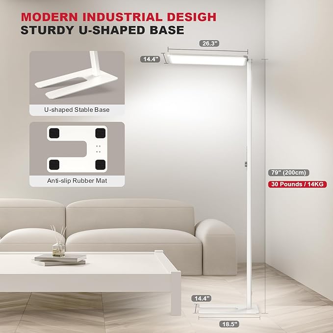 - 【Stable, Safe and Energy-Saving Floor Lamp】The modern led floor lamp body is made of aluminum alloy and high-strength steel, the U-shaped stable base can be easily inserted into the edge of the desk, preventing the lamp from tipping over. No dazzling, No blue light, glare, and flicker, No bulb replacement worries. Plug and play, no electrician is required. Energy-saving and environment-friendly. 100,000 hours of long-lifespan. Feel confident to bring the premium style to your family.