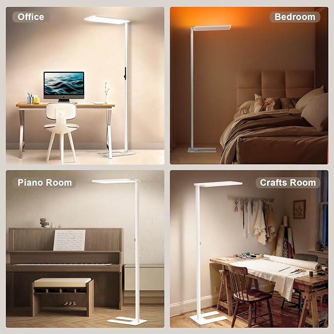 - 【Professional Eye Caring LED Standing Lamp】 The lamp equipped with Bridgelux Thrive SMD2835 full-spectrum LED lamp beads, phosphor and packaging technology to closely match the spectra of natural light over the visible wavelength range, provide 4000 lumens downwards and 7000 lumens upwards. No glare and no blue light, minimize the shadow, High CRI (CRI>98) & 11000LM help you see every detail of the objects and seeing the more accurate colors.