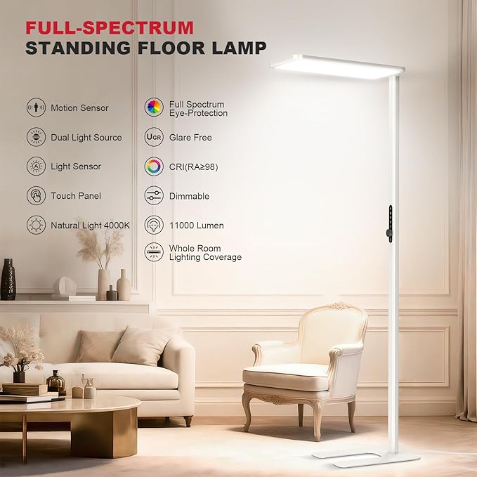 JINIU 79” Eye-Care LED Floor Lamp, Bridgelux Thrive™ Full-Spectrum Standing Lamp, 150W 11000LM, Dimmable 4000K Natural Daylight, Motion Sensor for Home Office, Playroom, Special Nightlight for Bedroom