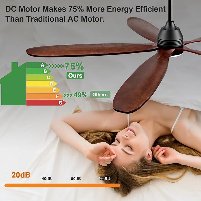 - Quiet Reversible Motor: This premium DC motor ensures a year-round comfortable experience, operating silently with noise levels under 30dB. It features both forward and reverse modes. During summer, it delivers powerful cooling breezes to reduce heat, while in winter, it enhances air circulation to alleviate the cold.