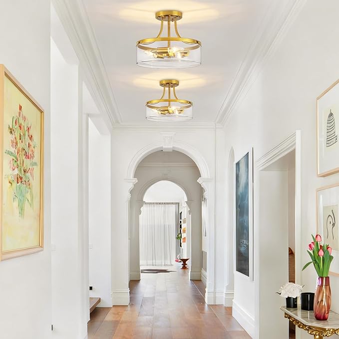 - ✨ HAND-BLOWN GLASS LIGHT FIXTURE : Crafted from high-quality metal and clear hand-blown glass with a durable finish, this fixture is built to last. Its smooth lines and neutral style blend effortlessly into a variety of décor styles—from modern minimalist to transitional and traditional—making it an elegant ceiling light fixture and a refined hallway light fixtures or entryway light fixture. UL-certified for safety and backed by a 2-year warranty, it’s built for peace of mind and everyday reliability