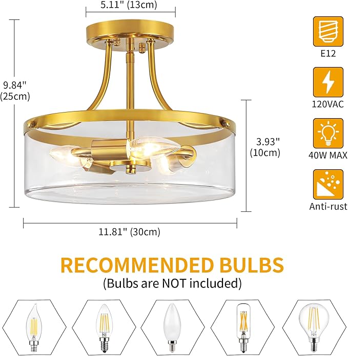 - ✨ EASY TO INSTALL & CLEAN : With a diameter of 11.81" D x 9.84" H, this semi flush mount ceiling light fits standard ceilings with ease among other close to ceiling light fixtures and compact ceiling light fixture options. All installation accessories and instructions are included for quick, hassle-free setup. The smooth glass surface is easy to clean—just wipe with a damp cloth. 💡 If you have any questions, please feel free to contact us. We are happy to assist