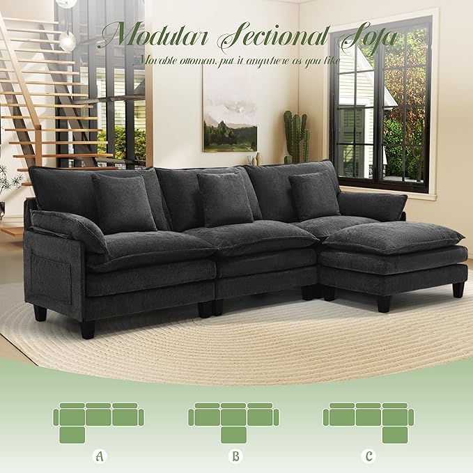- ๐งฉ ๐๐จ๐๐ฎ๐ฅ๐๐ซ & ๐๐๐๐ ๐ญ๐จ ๐๐จ๐ฏ๐ ๐ฐ๐ข๐ญ๐ก ๐๐จ๐ฎ: This 3-seat cloud couch plus ottoman (overall size: 106โW x 54โD x 37โH) can be rearranged to fit your space and mood. Whether you want an L-shape, a chaise lounge, or separate seating zones, the modular design lets you play interior designer anytimeโno tools, no stress.