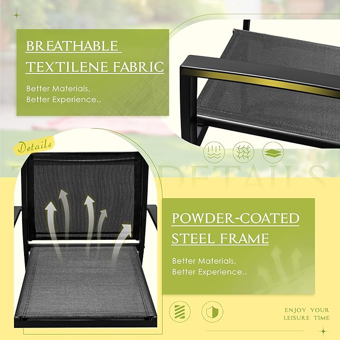 - [ Breathable & Cool Comfort ] The seat and backrest are made of selected Textilene mesh fabric, designed specifically for outdoor furniture. The porous material keeps you cool and comfortable even on hot summer days. Easy to clean—just wipe with a dry or damp cloth