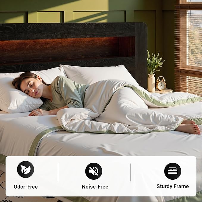 - Smart Charging Headboard: This king bed frame with headboard features 2 standard outlets & 2 USB ports, plus a 6-foot power cord — perfect for charging your phone, tablet, or reading light without leaving bed