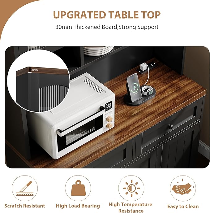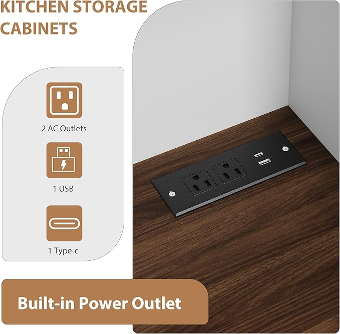 - Built-in Charging Station for Modern Living: Equipped with 2 AC outlets, 1 USB port, and 1 Type-C port, this kitchen cabinet lets you conveniently charge devices and power small appliances like coffee makers. Say goodbye to messy cords and power strip clutter.