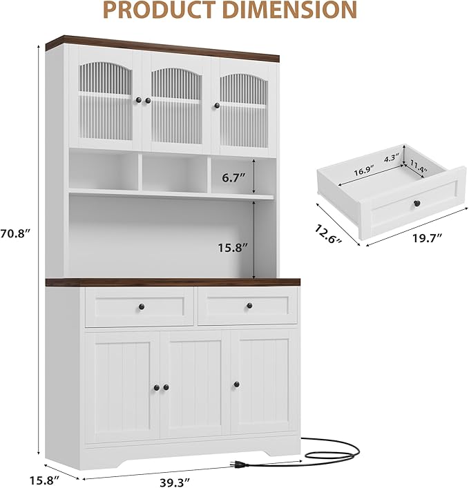 - Elegant Fluted Glass & Stylish Design: Featuring textured fluted glass on the upper compartments, this kitchen hutch storage cabinet adds a touch of contemporary farmhouse charm while maintaining privacy and durability in your kitchen or dining space.