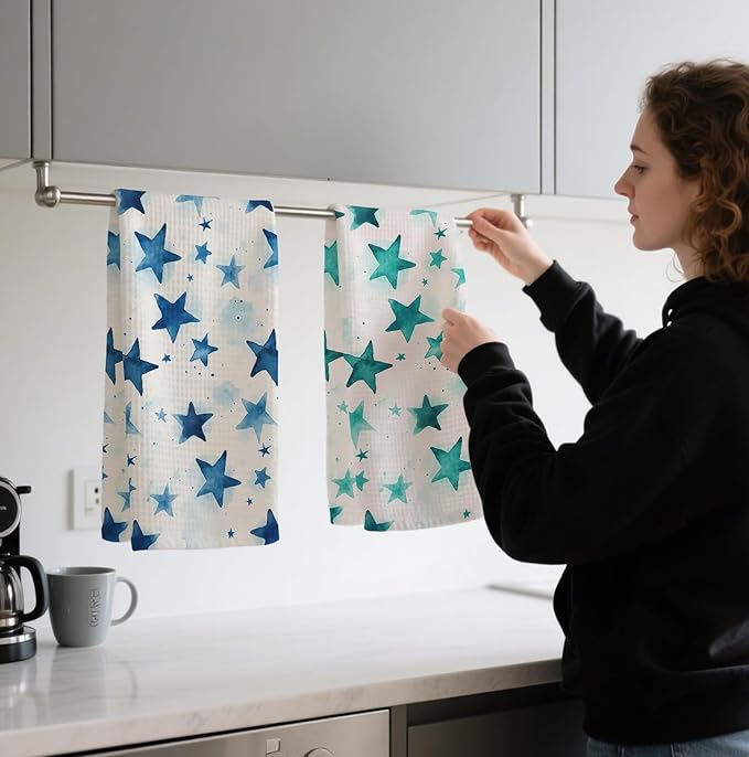 2-Pack Watercolor Star Towel, Star Waffle Towels, Nursery & Bathroom Hand Towel, 16x24 Inch Blue & Azure Dish Tea Towel Decor for Kitchen & Nursery & Bathroom, Gift For Friends & Homeowners.