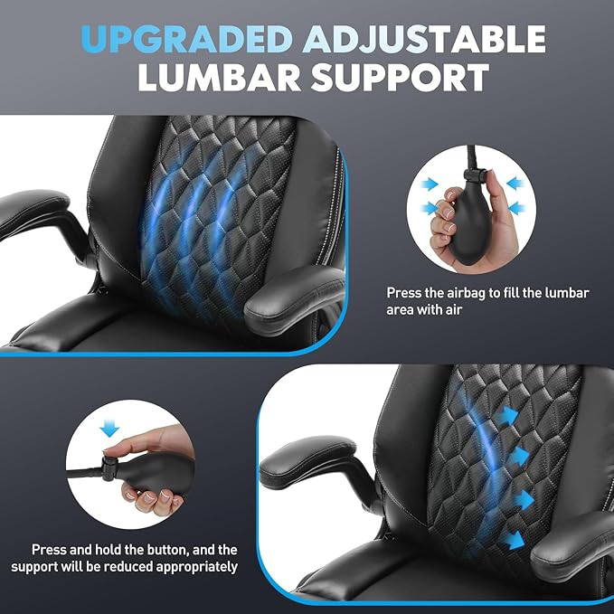 - AIR-FLOW LUMBAR SUPPORT: Experience customized comfort with our air-cushion lumbar system of comfortable desk chair. The adjustable technology lets you inflate or deflate the support to match your spinal curvature. This targeted support helps maintain natural lumbar alignment, reducing strain and discomfort during long sitting.