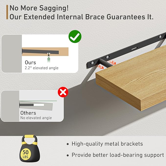 - Easy & Complete Mounting Kit Included:Install your new floating shelves in minutes, not hours! Every shelf comes with a complete kit including invisible steel brackets, toggle bolts for drywall, and a clear instruction manual. Our hassle-free installation process means you can have your floating shelf for wall securely mounted quickly and easily.