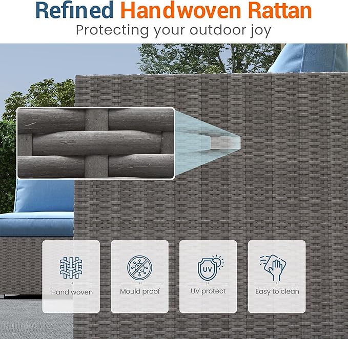 - 【Expansive, Deep-Seating Comfort】Experience the exceptional comfort of this outdoor sectional. The cushions offer a spacious 25" W x 25" D footprint, providing a deep, roomy seat for superior relaxation. At 4 inches thick and crafted with high-grade, 28-density foam, they ensure lasting resilience and shape retention, making this ratten outdoor furniture both incredibly comfortable and durable.