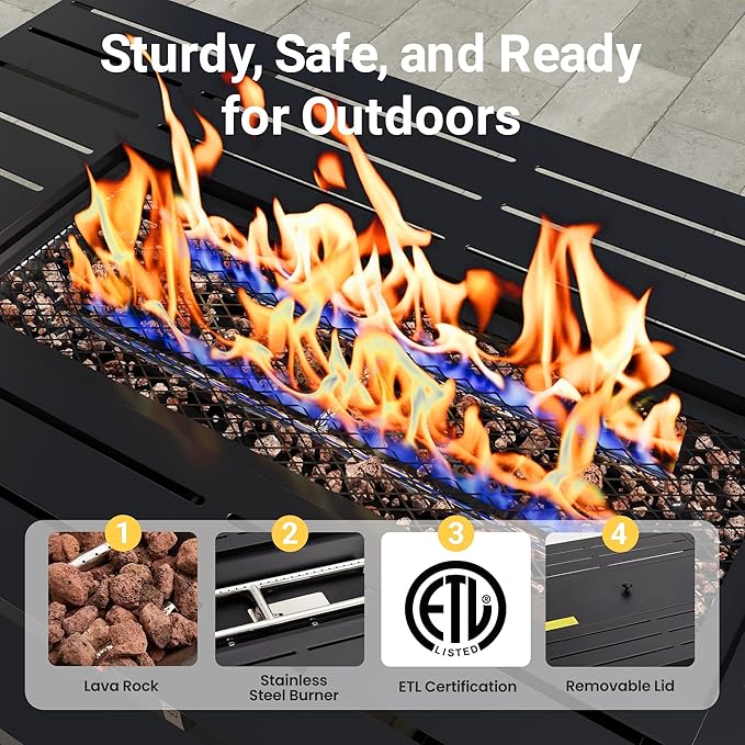 - 【Versatile 2-in-1 Fire Pit Table】The centerpiece of this ratten outdoor furniture set is a multifunctional fire table. Its convertible design, with a removable lid, allows it to transition seamlessly from a cozy fire pit to a practical table. Generating up to 50,000 BTU of heat, it ensures reliable warmth and ambiance, making it perfect for both intimate gatherings and outdoor dining.