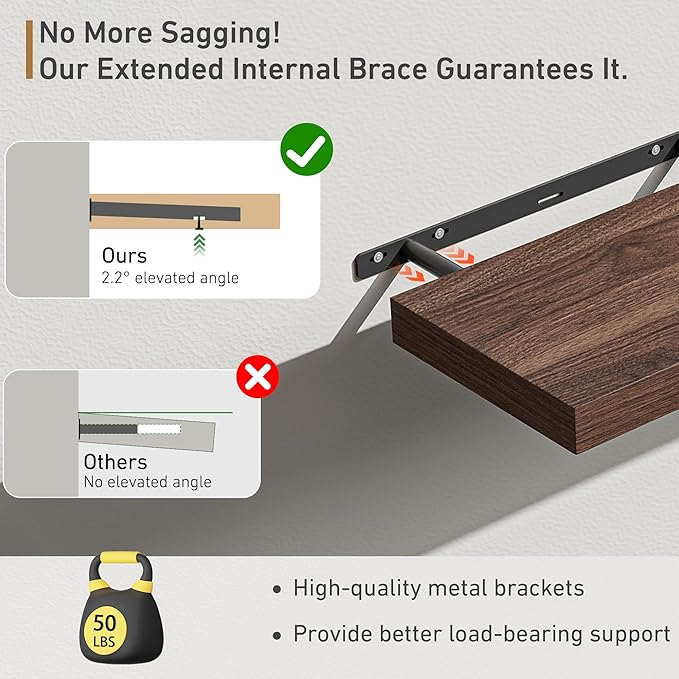 - Easy & Complete Mounting Kit Included:Install your new floating shelves in minutes, not hours! Every shelf comes with a complete kit including invisible steel brackets, toggle bolts for drywall, and a clear instruction manual. Our hassle-free installation process means you can have your floating shelf for wall securely mounted quickly and easily.