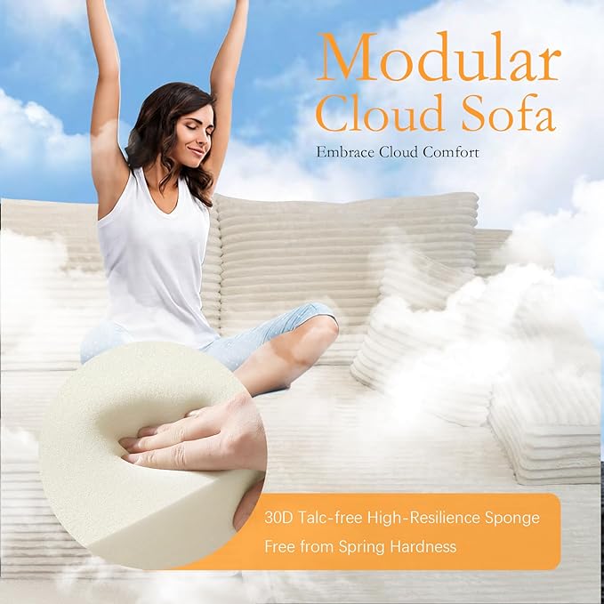 - No Assembly Required and Easy Care: Your modular cloud sofa arrives in two boxes, please be patient and wait for all your parcels to be delivered. After receive that, simply unbox, gently pat the cushions to revive their springy loft, and let it expand to its full, photogenic shape within 72 hours. The faux fur cover resists everyday spills and stains, all you need is a mini vacuum or a damp rag to make your cleaning easy