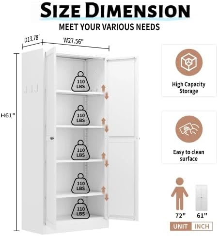 61'' Storage Cabinet, 4 Adjustable Shelves Kitchen Pantry with 2 Doors, Tall White Metal Storage Cabinet with External Hooks, Heavy-Duty Farmhouse Pantry for Kitchen Living Room