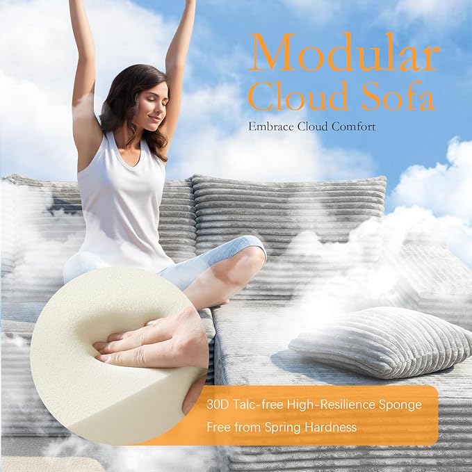 - No Assembly Required and Easy Care: Your modular cloud sofa arrives in two boxes, please be patient and wait for all your parcels to be delivered. After receive that, simply unbox, gently pat the cushions to revive their springy loft, and let it expand to its full, photogenic shape within 72 hours. The faux fur cover resists everyday spills and stains, all you need is a mini vacuum or a damp rag to make your cleaning easy