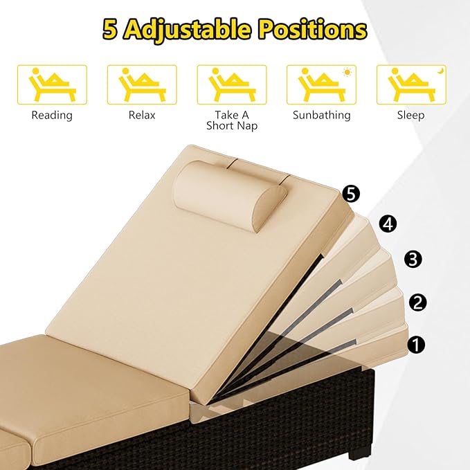 - Slow-paced: Lounge out in the sun, getting your tan back on with this Sunbathing chaise lounge. Provides maximum comfort with 6 adjustable back positions, which will fit your different needs of reading, relaxing, and sleeping, serving as a bed, lounge or sofa.