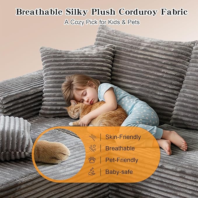 - Pet & Kid-Friendly: Upholstered in soft, anti-wrinkle, and stain-resistant corduroy fabric, it features a soft, frameless build with no sharp edges or wooden legs, making every bump and tumble safe. The resilient fabric expertly conceals pet scratches, while its smooth surface prevents toys from getting lost underneath. Spills and messes clean up effortlessly, making it the perfect spot for kids and pets to play, nap, and grow.